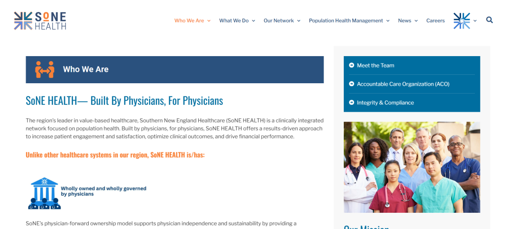 Based in Hartford, SoNE HEALTH is a physician-led, clinically integrated network focused on optimizing population health for communities across southern New England. The site reflects strategic complexity—from MSO solutions and care management to contracting, credentialing, and value-based care—through a clean, organized presentation of services, mission, vision, and values, structured across integrated navigation that supports both provider and patient audiences.